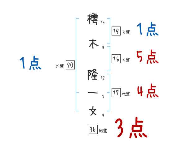 総運![]() | 樗木隆一文さんの総運は36画の3つ星!先見性が豊かです。多少神経質で苦労することも。 あなたの人生を表す1番重要な運勢です。生涯を通じて影響する総合運となり、主に50歳以降の晩年期に影響を及ぼします。 |