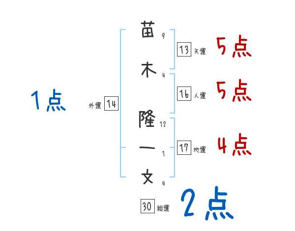 人運![]() | 苗木隆一文さんの人運は16画の5つ星!人望が厚く大きく発展する。逆転成功が見える。 性格や才能などを表す2番目に重要な運勢です。人間関係や協調性、社会的な成功に影響します。主に20歳から50歳ぐらいまでの中年期の運勢を表します。 |
