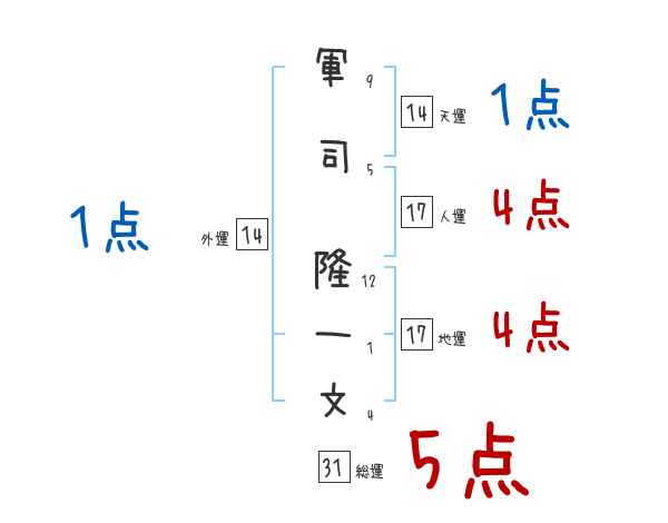 天運![]() | 軍司隆一文さんの天運は14画の1つ星!人に対して優しいがストレスを溜め込みがち。人間関係のトラブルを避けるよう気をつけましょう。 家系が持つ宿命的な運勢を表します。祖先から受け継いだ苗字ですので自分の力が及びません。家柄を象徴します。 |