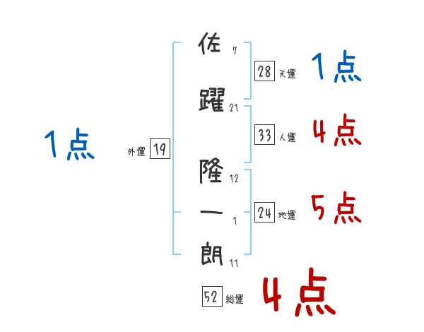 天運![]() | 佐躍隆一朗さんの天運は28画の1つ星!家庭環境に注意。スポーツで活躍できる能力があるかも。 家系が持つ宿命的な運勢を表します。祖先から受け継いだ苗字ですので自分の力が及びません。家柄を象徴します。 |