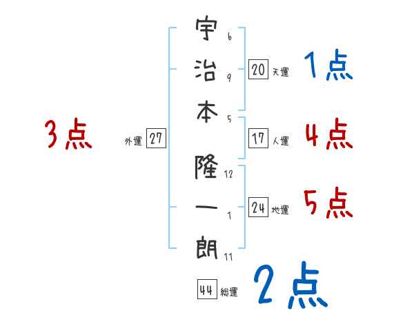 総運![]() | 宇治本隆一朗さんの総運は44画の2つ星!誠実で慎重な性格。物事を考えすぎないように注意しましょう。 あなたの人生を表す1番重要な運勢です。生涯を通じて影響する総合運となり、主に50歳以降の晩年期に影響を及ぼします。 |
