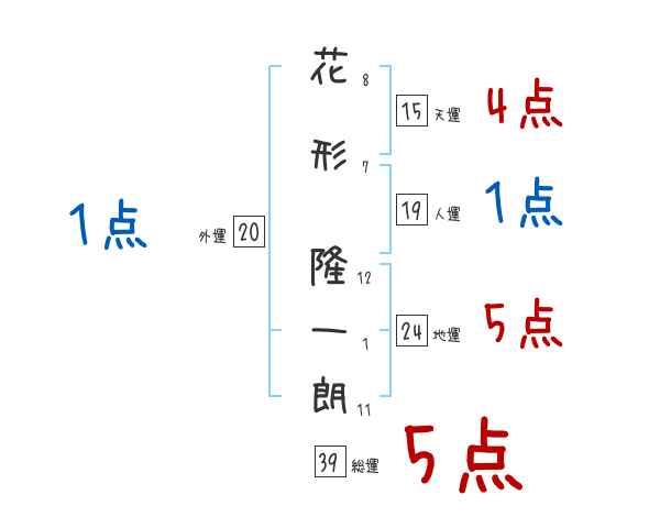 総運![]() | 花形隆一朗さんの総運は39画の5つ星!社交性に優れ人望が厚い。人の上に立ち成功する。 あなたの人生を表す1番重要な運勢です。生涯を通じて影響する総合運となり、主に50歳以降の晩年期に影響を及ぼします。 |