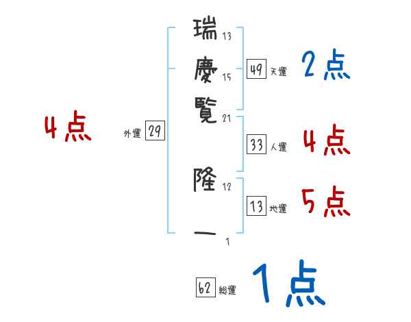 天運![]() | 瑞慶覧隆一さんの天運は49画の2つ星!不安定な性格で明暗がある人生。周りの人には支援されやすい。 家系が持つ宿命的な運勢を表します。祖先から受け継いだ苗字ですので自分の力が及びません。家柄を象徴します。 |