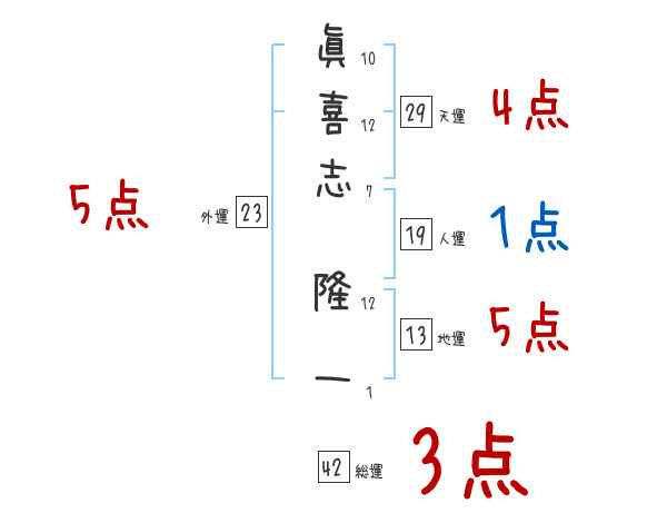 総運![]() | 眞喜志隆一さんの総運は42画の3つ星!病気に注意。多芸であるが消極的でおとなしい。 あなたの人生を表す1番重要な運勢です。生涯を通じて影響する総合運となり、主に50歳以降の晩年期に影響を及ぼします。 |