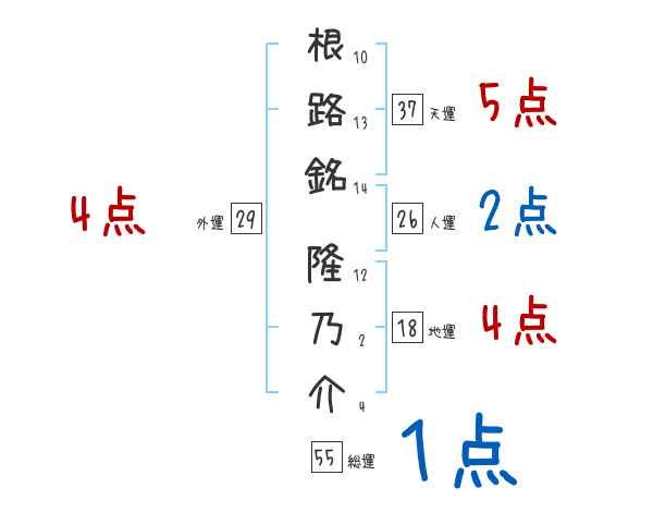 地運![]() | 根路銘隆乃介さんの地運は18画の4つ星!情熱的で剛気。忍耐力があり信頼される。 個性を表す基礎的な運勢です。性格形成や対人関係、行動力など家庭環境に影響されます。主に誕生してから20歳くらいまでの若年期の運勢を表します。 |