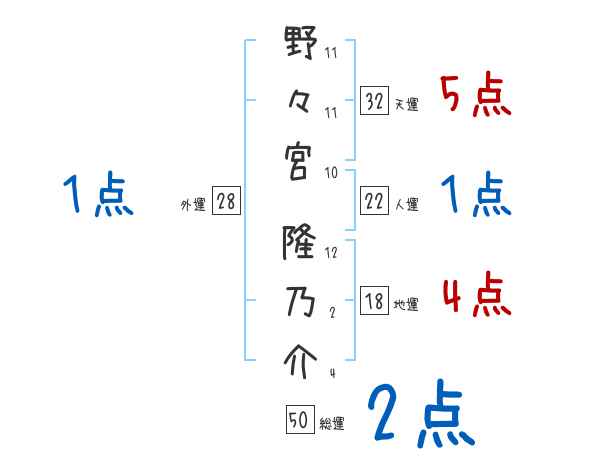天運![]() | 野々宮隆乃介さんの天運は32画の5つ星!柔軟性があり成功する。チャンスが多く金運が良い。 家系が持つ宿命的な運勢を表します。祖先から受け継いだ苗字ですので自分の力が及びません。家柄を象徴します。 |