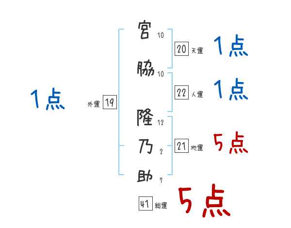 外運![]() | 宮脇隆乃助さんの外運は19画の1つ星!優れた才能を持ちますが、協調性が足りないことも。周りの人と協力する事を意識しましょう。 生活面を象徴する運勢です。外部から受ける影響力を表し、結婚運、家庭運や職場、環境への順応性を表します。 |