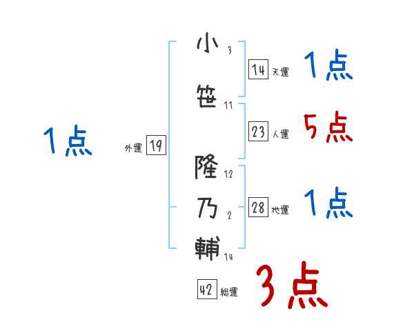 天運![]() | 小笹隆乃輔さんの天運は14画の1つ星!人に対して優しいがストレスを溜め込みがち。人間関係のトラブルを避けるよう気をつけましょう。 家系が持つ宿命的な運勢を表します。祖先から受け継いだ苗字ですので自分の力が及びません。家柄を象徴します。 |