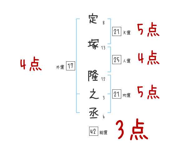 天運![]() | 定塚隆之丞さんの天運は21画の5つ星!統率力がある。独立し成功する。名誉を手に入れる。 家系が持つ宿命的な運勢を表します。祖先から受け継いだ苗字ですので自分の力が及びません。家柄を象徴します。 |