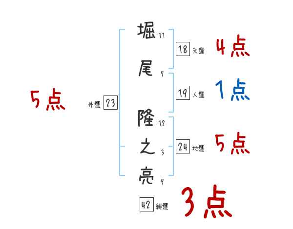 | 外運  | 堀尾隆之亮さんの外運は23画の5つ星!想像力に優れ活力がある。一代で成功し名誉を手に入れる。生活面を象徴する運勢です。外部から受ける影響力を表し、結婚運、家庭運や職場、環境への順応性を表します。 |
