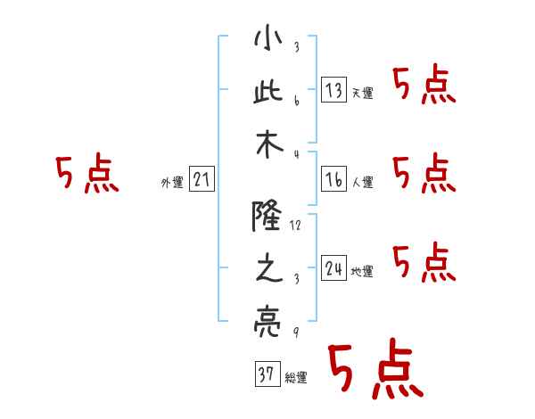 人運![]() | 小此木隆之亮さんの人運は16画の5つ星!人望が厚く大きく発展する。逆転成功が見える。 性格や才能などを表す2番目に重要な運勢です。人間関係や協調性、社会的な成功に影響します。主に20歳から50歳ぐらいまでの中年期の運勢を表します。 |