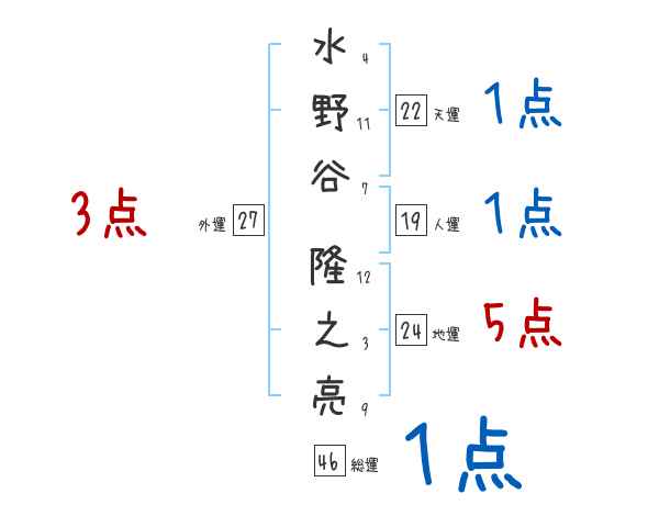 天運![]() | 水野谷隆之亮さんの天運は22画の1つ星!努力することが苦手ないっぽう手先が器用。芸術性にも優れる。 家系が持つ宿命的な運勢を表します。祖先から受け継いだ苗字ですので自分の力が及びません。家柄を象徴します。 |