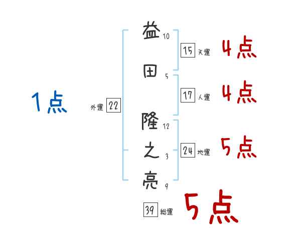総運![]() | 益田隆之亮さんの総運は39画の5つ星!社交性に優れ人望が厚い。人の上に立ち成功する。 あなたの人生を表す1番重要な運勢です。生涯を通じて影響する総合運となり、主に50歳以降の晩年期に影響を及ぼします。 |