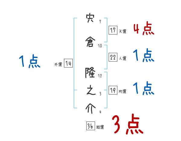 天運![]() | 宍倉隆之介さんの天運は17画の4つ星!積極的な行動力。地位を気づき財産を手に入れる。純粋な心と直感力。 家系が持つ宿命的な運勢を表します。祖先から受け継いだ苗字ですので自分の力が及びません。家柄を象徴します。 |