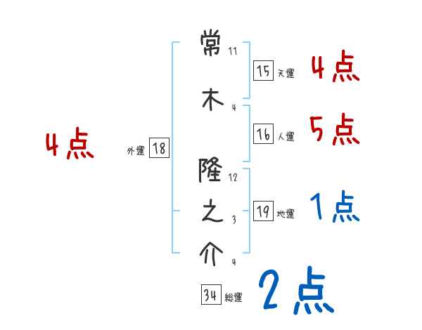 人運![]() | 常木隆之介さんの人運は16画の5つ星!人望が厚く大きく発展する。逆転成功が見える。 性格や才能などを表す2番目に重要な運勢です。人間関係や協調性、社会的な成功に影響します。主に20歳から50歳ぐらいまでの中年期の運勢を表します。 |
