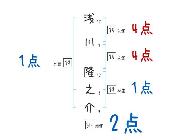 外運![]() | 浅川隆之介さんの外運は19画の1つ星!優れた才能を持ちますが、協調性が足りないことも。周りの人と協力する事を意識しましょう。 生活面を象徴する運勢です。外部から受ける影響力を表し、結婚運、家庭運や職場、環境への順応性を表します。 |