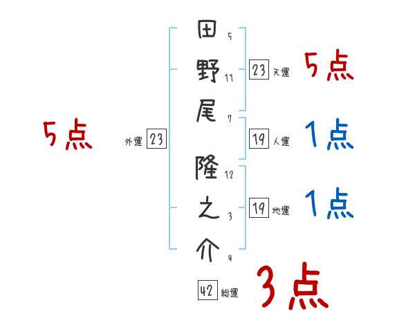 天運![]() | 田野尾隆之介さんの天運は23画の5つ星!想像力に優れ活力がある。一代で成功し名誉を手に入れる。 家系が持つ宿命的な運勢を表します。祖先から受け継いだ苗字ですので自分の力が及びません。家柄を象徴します。 |