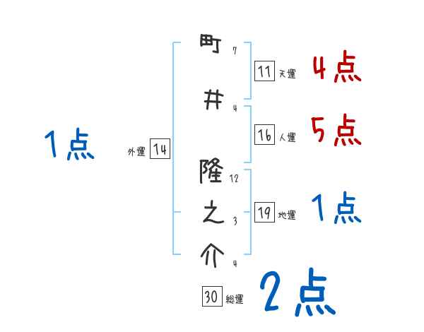 人運![]() | 町井隆之介さんの人運は16画の5つ星!人望が厚く大きく発展する。逆転成功が見える。 性格や才能などを表す2番目に重要な運勢です。人間関係や協調性、社会的な成功に影響します。主に20歳から50歳ぐらいまでの中年期の運勢を表します。 |