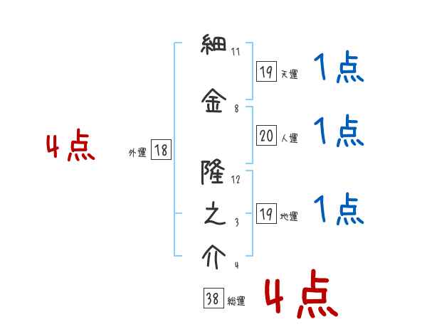 天運![]() | 細金隆之介さんの天運は19画の1つ星!優れた才能を持ちますが、協調性が足りないことも。周りの人と協力する事を意識しましょう。 家系が持つ宿命的な運勢を表します。祖先から受け継いだ苗字ですので自分の力が及びません。家柄を象徴します。 |