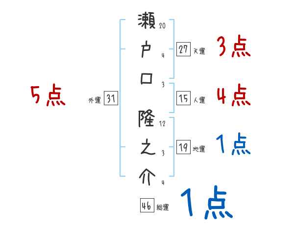 総運![]() | 瀬戸口隆之介さんの総運は46画の1つ星!迷走することが多く苦労するかも。目先のことにとらわれないように。 あなたの人生を表す1番重要な運勢です。生涯を通じて影響する総合運となり、主に50歳以降の晩年期に影響を及ぼします。 |