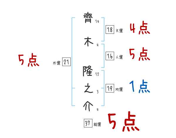 総運![]() | 齊木隆之介さんの総運は37画の5つ星!努力家で順応性に優れる。現実的な考え方ができ忠実に物事をこなす。 あなたの人生を表す1番重要な運勢です。生涯を通じて影響する総合運となり、主に50歳以降の晩年期に影響を及ぼします。 |