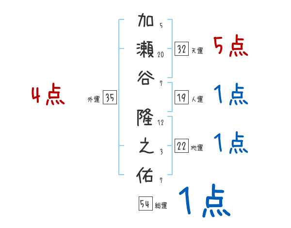 外運![]() | 加瀬谷隆之佑さんの外運は35画の4つ星!温厚な性格で感受性が高い。穏和な性格で人望が厚い。 生活面を象徴する運勢です。外部から受ける影響力を表し、結婚運、家庭運や職場、環境への順応性を表します。 |