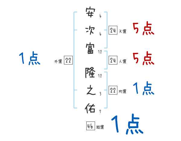 天運![]() | 安次富隆之佑さんの天運は24画の5つ星!家庭運が良く順調な人生。金運にも恵まれる。 家系が持つ宿命的な運勢を表します。祖先から受け継いだ苗字ですので自分の力が及びません。家柄を象徴します。 |