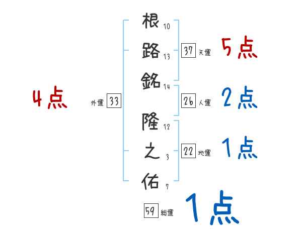 天運![]() | 根路銘隆之佑さんの天運は37画の5つ星!努力家で順応性に優れる。現実的な考え方ができ忠実に物事をこなす。 家系が持つ宿命的な運勢を表します。祖先から受け継いだ苗字ですので自分の力が及びません。家柄を象徴します。 |