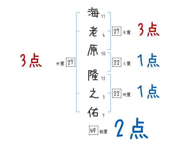 天運![]() | 海老原隆之佑さんの天運は27画の3つ星!頭脳明晰だが強情で摩擦が多い傾向。孤立に注意。 家系が持つ宿命的な運勢を表します。祖先から受け継いだ苗字ですので自分の力が及びません。家柄を象徴します。 |