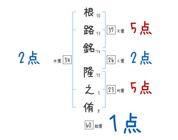 地運![]() | 根路銘隆之侑さんの地運は23画の5つ星!想像力に優れ活力がある。一代で成功し名誉を手に入れる。 個性を表す基礎的な運勢です。性格形成や対人関係、行動力など家庭環境に影響されます。主に誕生してから20歳くらいまでの若年期の運勢を表します。 |