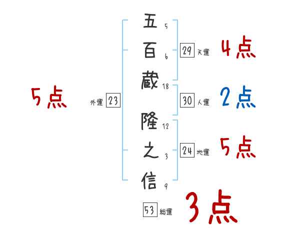 総運![]() | 五百蔵隆之信さんの総運は53画の3つ星!やや見栄っ張りで虚栄心がある。散財に注意。 あなたの人生を表す1番重要な運勢です。生涯を通じて影響する総合運となり、主に50歳以降の晩年期に影響を及ぼします。 |