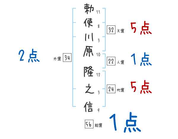 天運![]() | 勅使川原隆之信さんの天運は32画の5つ星!柔軟性があり成功する。チャンスが多く金運が良い。 家系が持つ宿命的な運勢を表します。祖先から受け継いだ苗字ですので自分の力が及びません。家柄を象徴します。 |