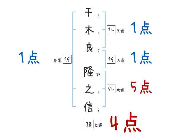 人運![]() | 千木良隆之信さんの人運は19画の1つ星!優れた才能を持ちますが、協調性が足りないことも。周りの人と協力する事を意識しましょう。 性格や才能などを表す2番目に重要な運勢です。人間関係や協調性、社会的な成功に影響します。主に20歳から50歳ぐらいまでの中年期の運勢を表します。 |