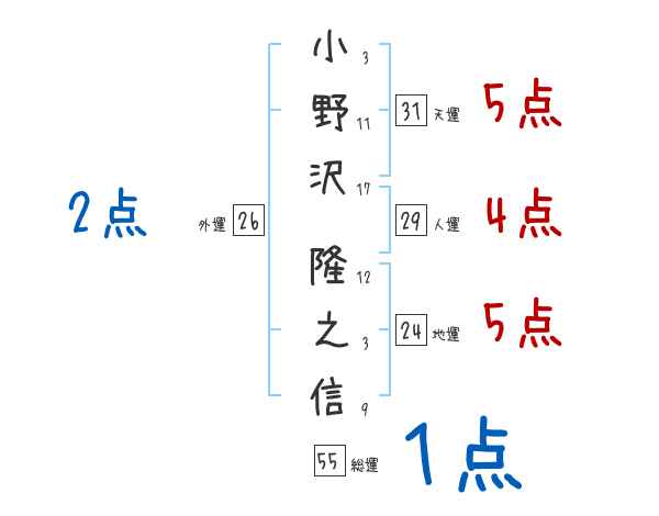 外運![]() | 小野沢隆之信さんの外運は26画の2つ星!波瀾万丈かも。信頼できる人を大事にしましょう。 生活面を象徴する運勢です。外部から受ける影響力を表し、結婚運、家庭運や職場、環境への順応性を表します。 |