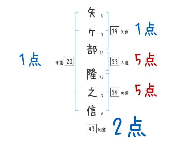 矢ヶ部隆之信さんの総運は43画の2つ星