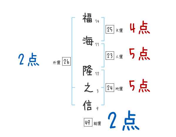 外運![]() | 福海隆之信さんの外運は26画の2つ星!波瀾万丈かも。信頼できる人を大事にしましょう。 生活面を象徴する運勢です。外部から受ける影響力を表し、結婚運、家庭運や職場、環境への順応性を表します。 |