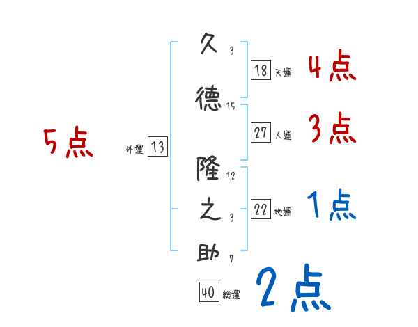 天運![]() | 久德隆之助さんの天運は18画の4つ星!情熱的で剛気。忍耐力があり信頼される。 家系が持つ宿命的な運勢を表します。祖先から受け継いだ苗字ですので自分の力が及びません。家柄を象徴します。 |