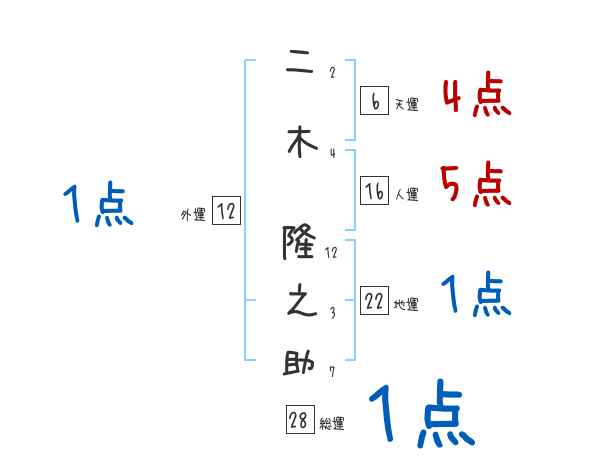 人運![]() | 二木隆之助さんの人運は16画の5つ星!人望が厚く大きく発展する。逆転成功が見える。 性格や才能などを表す2番目に重要な運勢です。人間関係や協調性、社会的な成功に影響します。主に20歳から50歳ぐらいまでの中年期の運勢を表します。 |