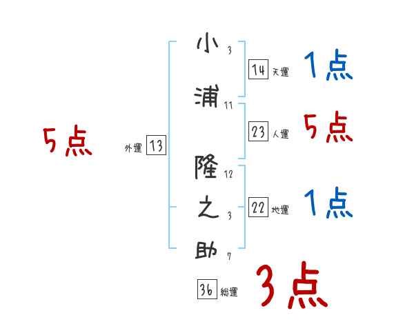 総運![]() | 小浦隆之助さんの総運は36画の3つ星!先見性が豊かです。多少神経質で苦労することも。 あなたの人生を表す1番重要な運勢です。生涯を通じて影響する総合運となり、主に50歳以降の晩年期に影響を及ぼします。 |