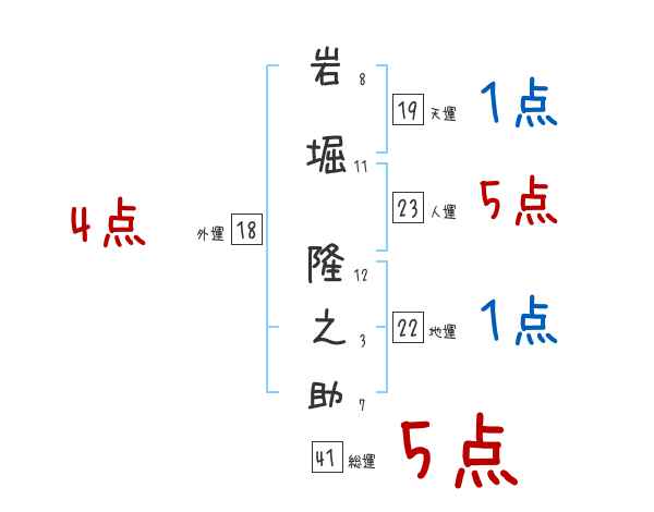 人運![]() | 岩堀隆之助さんの人運は23画の5つ星!想像力に優れ活力がある。一代で成功し名誉を手に入れる。 性格や才能などを表す2番目に重要な運勢です。人間関係や協調性、社会的な成功に影響します。主に20歳から50歳ぐらいまでの中年期の運勢を表します。 |
