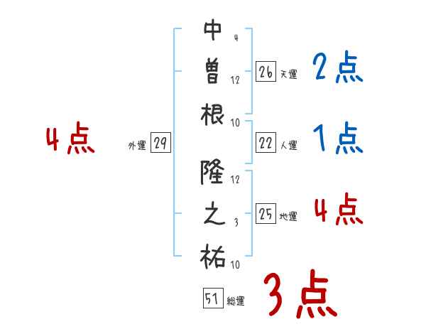 総運![]() | 中曽根隆之祐さんの総運は51画の3つ星!変化が激しく、危険に注意。堅実な性格。 あなたの人生を表す1番重要な運勢です。生涯を通じて影響する総合運となり、主に50歳以降の晩年期に影響を及ぼします。 |