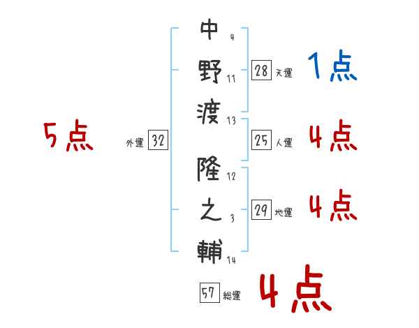 総運![]() | 中野渡隆之輔さんの総運は57画の4つ星!向上心があり人望がある。地位を得る。 あなたの人生を表す1番重要な運勢です。生涯を通じて影響する総合運となり、主に50歳以降の晩年期に影響を及ぼします。 |