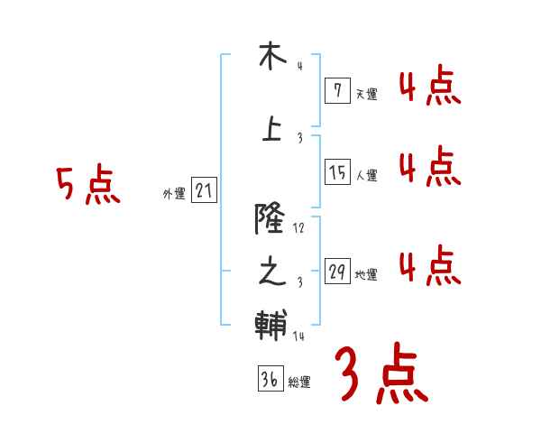 天運![]() | 木上隆之輔さんの天運は7画の4つ星!強い意志や信念を持ち独立心が強い。自立する。 家系が持つ宿命的な運勢を表します。祖先から受け継いだ苗字ですので自分の力が及びません。家柄を象徴します。 |