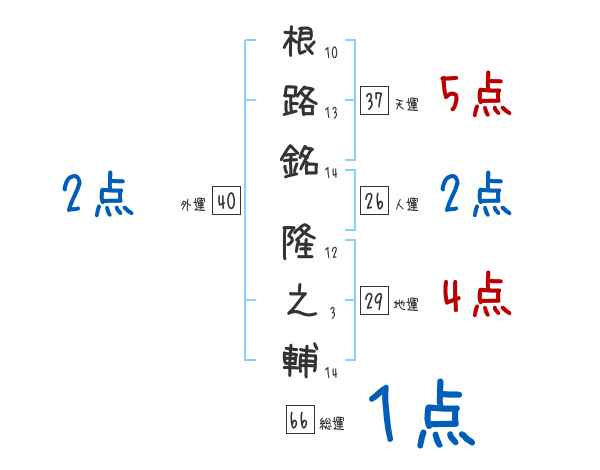 地運![]() | 根路銘隆之輔さんの地運は29画の4つ星!完全主義で才能がある。厳格な心の持ち主。 個性を表す基礎的な運勢です。性格形成や対人関係、行動力など家庭環境に影響されます。主に誕生してから20歳くらいまでの若年期の運勢を表します。 |