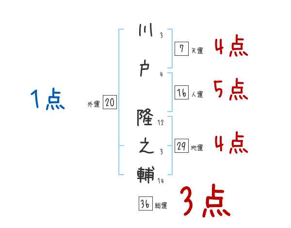 天運![]() | 川戸隆之輔さんの天運は7画の4つ星!強い意志や信念を持ち独立心が強い。自立する。 家系が持つ宿命的な運勢を表します。祖先から受け継いだ苗字ですので自分の力が及びません。家柄を象徴します。 |