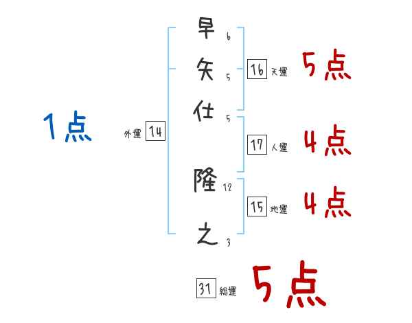 天運![]() | 早矢仕隆之さんの天運は16画の5つ星!人望が厚く大きく発展する。逆転成功が見える。 家系が持つ宿命的な運勢を表します。祖先から受け継いだ苗字ですので自分の力が及びません。家柄を象徴します。 |