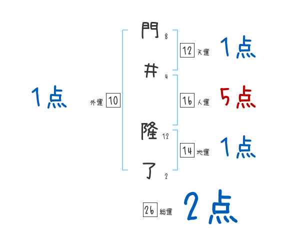 人運![]() | 門井隆了さんの人運は16画の5つ星!人望が厚く大きく発展する。逆転成功が見える。 性格や才能などを表す2番目に重要な運勢です。人間関係や協調性、社会的な成功に影響します。主に20歳から50歳ぐらいまでの中年期の運勢を表します。 |