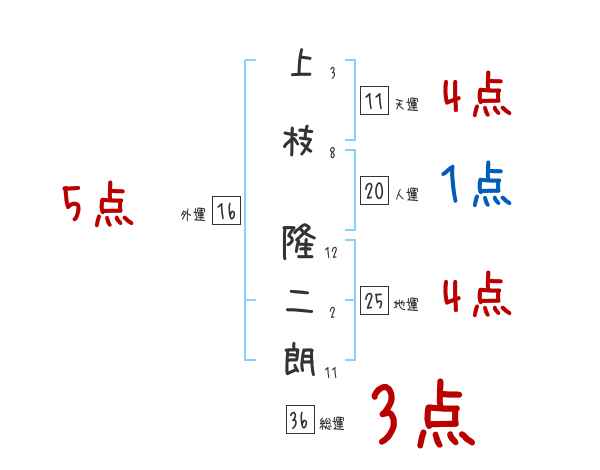 外運![]() | 上枝隆二朗さんの外運は16画の5つ星!人望が厚く大きく発展する。逆転成功が見える。 生活面を象徴する運勢です。外部から受ける影響力を表し、結婚運、家庭運や職場、環境への順応性を表します。 |