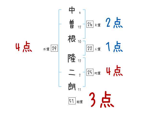 外運![]() | 中曽根隆二朗さんの外運は29画の4つ星!完全主義で才能がある。厳格な心の持ち主。 生活面を象徴する運勢です。外部から受ける影響力を表し、結婚運、家庭運や職場、環境への順応性を表します。 |