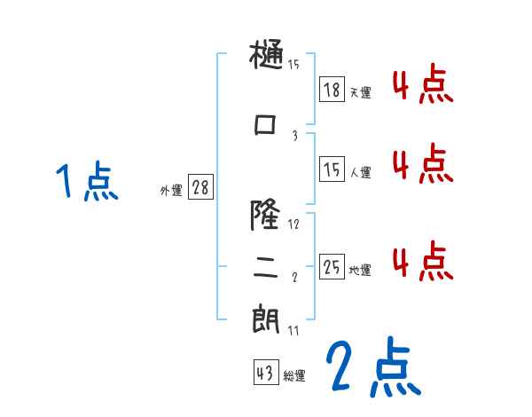 天運![]() | 樋口隆二朗さんの天運は18画の4つ星!情熱的で剛気。忍耐力があり信頼される。 家系が持つ宿命的な運勢を表します。祖先から受け継いだ苗字ですので自分の力が及びません。家柄を象徴します。 |